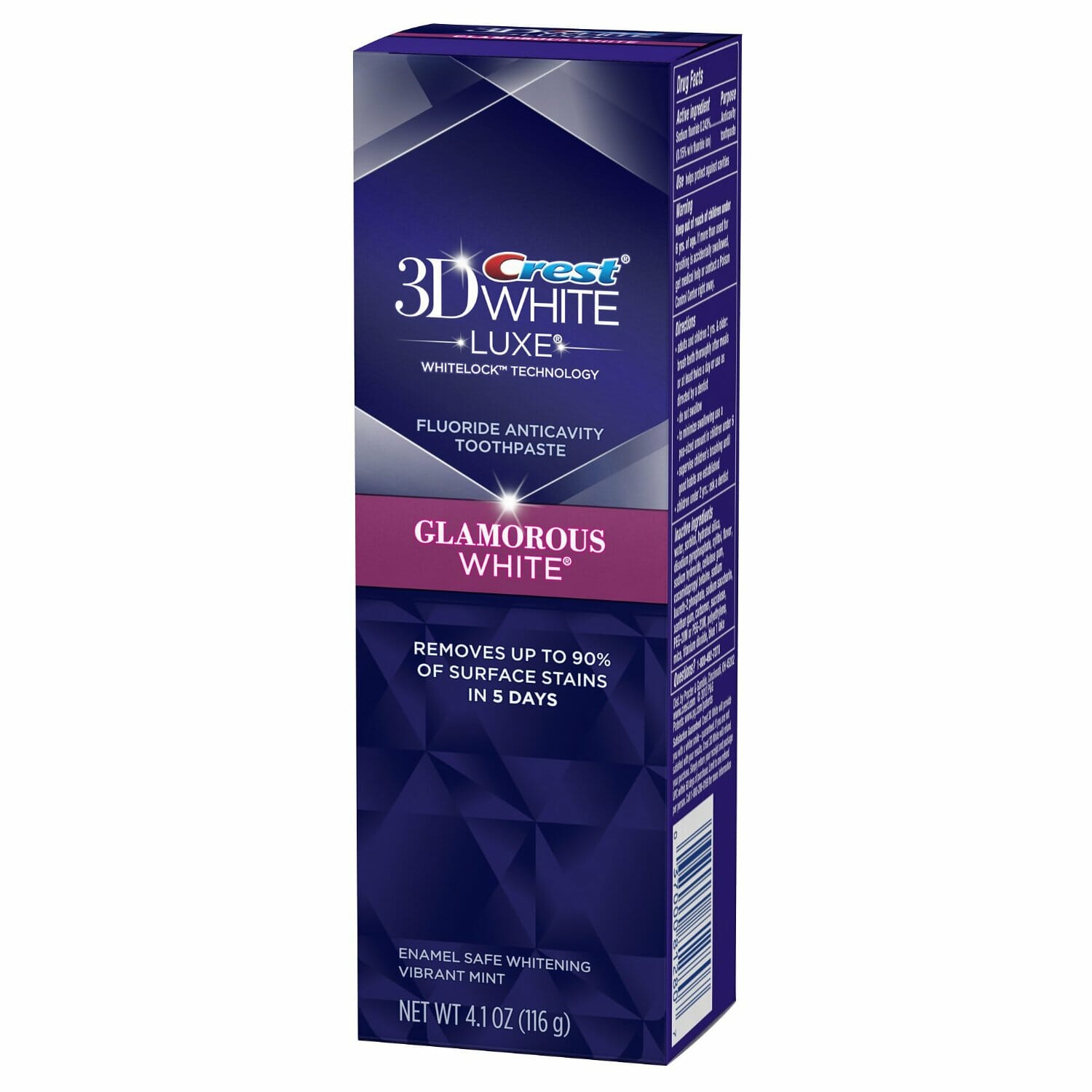 «Сrest 3D White Luxe Glamorous White» Люкс Гламурное Белое. Придает гламурности в каждый ваш день. Использует уникальную Whitelоck технологию, препятствует появлению пятен и удаляет 90% существующих. Используется безопасный для эмали фторид для предотвращения кариеса. Мягко но эффективно делает вашу улыбку яркой уже после первой чистки зубов. Делает вашу улыбку с каждым днем белее. Имеет нежное вспенивание для труднодоступных мест и микрочастицы для полировки поверхности зубов.