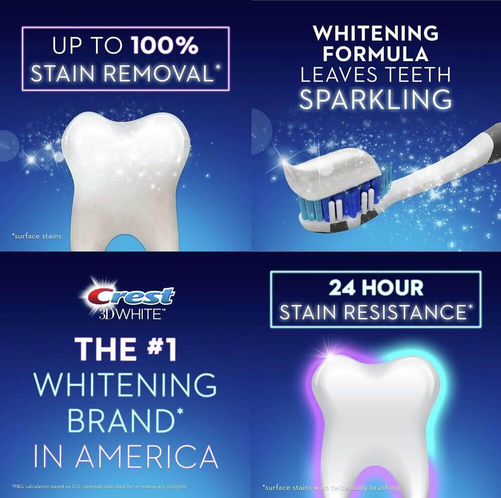 Зубная паста Crest 3DWhite Brilliance — это новинка с применением отбеливания быстрых технологий в сочетании с самой передовой защитой от пятен. Brilliance отбеливает зубы путем удаления до 95% поверхностных пятен за 3 дня.