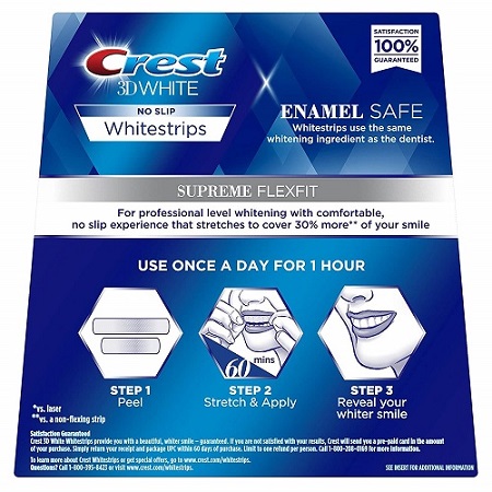 Crest Whitestrips используют профессиональные стоматологические ингредиенты. Результат отбеливания видно уже через 3 дня. Необходимо использовать один комплект в течении 60 минут каждый день. Активный ингредиент полосок проникает глубже поверхностного слоя эмали, благодаря этому отбеливающий эффект сохраняется на срок до 6-12 месяцев.